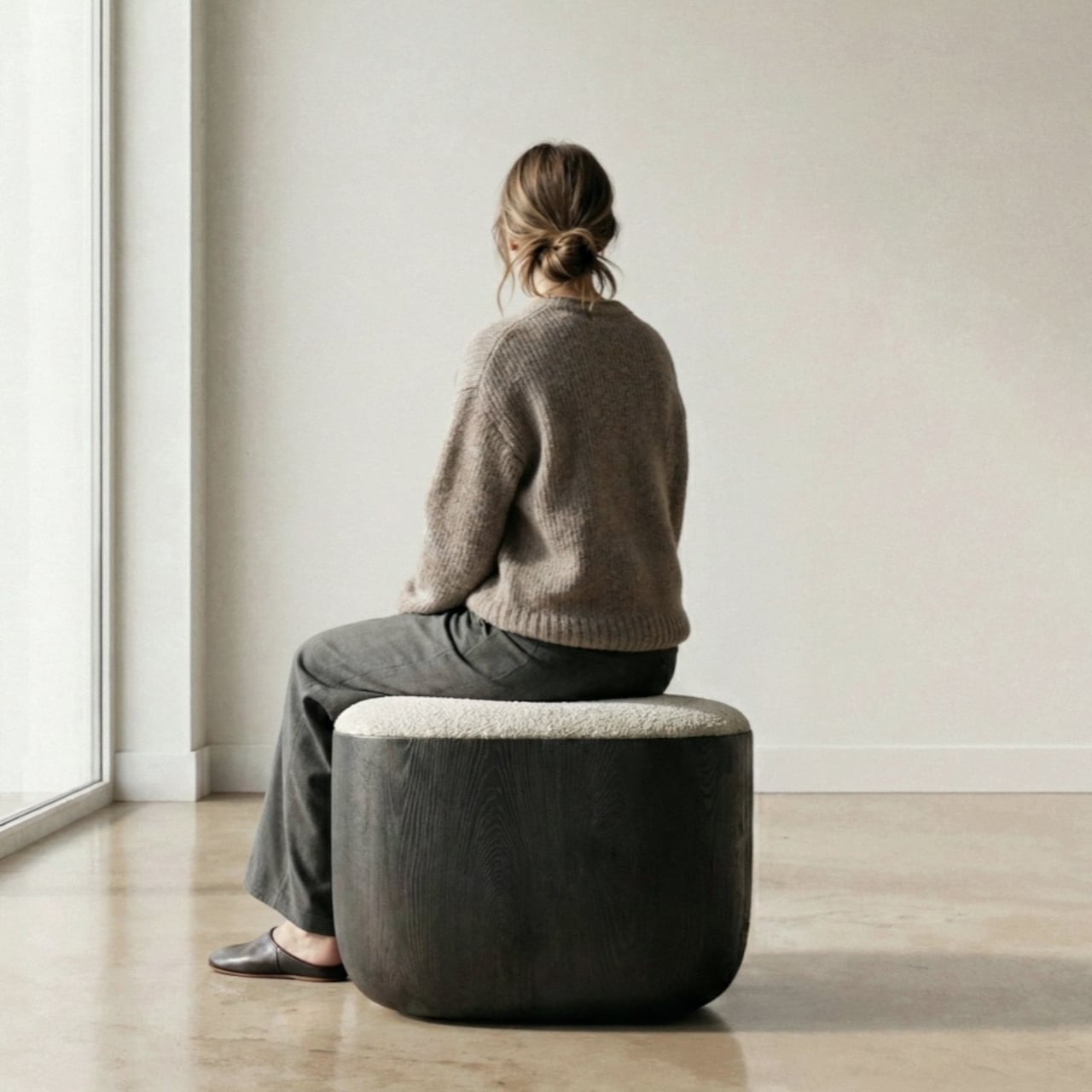 The material process behind that solidity gets genuinely obsessive. The stool is made from North American white oak, selected for grain consistency, kiln-dried, hand-shaped, then kiln-dried again, because the glue introduced during assembly brings moisture back into the wood. Most workshops skip that second drying. Mililab doesn’t. It’s sealed immediately after, locking in a 10% moisture content, the exact point at which white oak is most dimensionally stable.