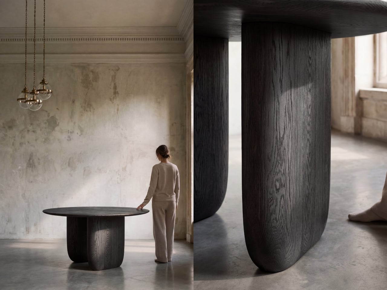 The story starts with the studio’s own Maru dining table. While developing it, founders Livert Lim and Mengfei Wu kept drifting back to the legs, almost despite themselves. Those legs tapered inward along one unbroken curve, giving them a presence that had little to do with the tabletop above. As Mililab described it: “A shape that didn’t need the table above it.” So they separated it and let it stand alone.